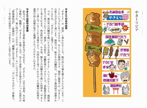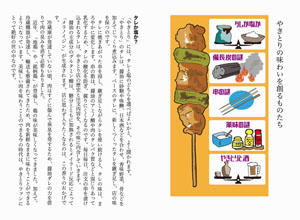 第一章は「やきとりの謎」として、「やきとり」の定義やデータなどのオモシロ雑学。第二章「やきとりの歴史」では、「やきとり」と肉食の歴史を検証。第三章の「やきとりの街探訪」は、ユニークな「やきとり」でまちおこしを図っている街と個性的な「やきとり」を紹介しています。第四章「やきとりメニュー小辞典」では、やきとりに使われる部位や素材について解説しました。