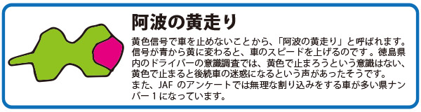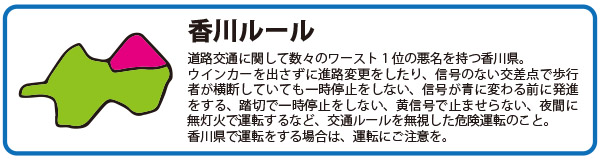 ただ、四国のどの地域もマナーの悪さは県外の人に認知されています。曰く「いつ曲がってくるかわからない」「車をなかなか入れてくれない」「とろとろ走っていた車が、急にスピードをあげて向かってくる」など批難ごうごうです。交通マナーの悪さをなくし、安全な運転を四国全体で競いたいものです。