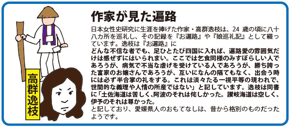 と記しています。逸枝は同書に「土佐海道は苦しく、阿波のそれは侘しかった。讃岐海道は空しく、伊予のそれは尊かった」とも記しており、愛媛県人のおもてなしは、昔から格別のものだったようです。 |