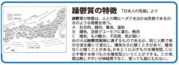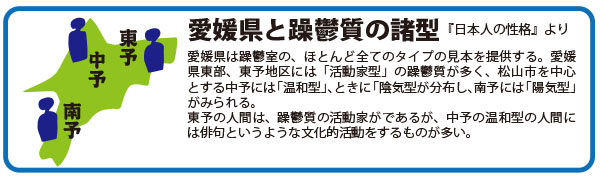 愛媛は躁鬱質のほとんどすべてのタイプをみせ、これが東予、中予、南予の違いにつながると宮城は指摘します。東予は「活動家型」、中予は「温和型」「陰気型」、南予は「陽気型」に属するというのです。