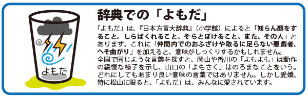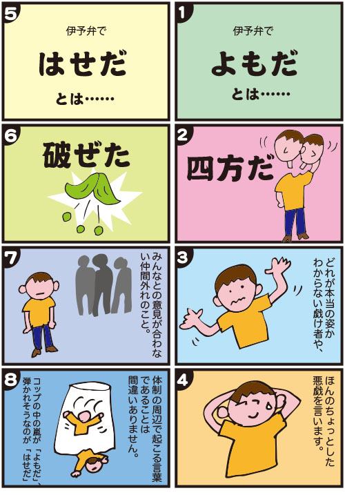 伊予弁に「よもだ」という言葉があります。仲間内で馬鹿なことをする人のことを指します。「四方山話」があれこれとつまらない話をすることを指すように、とるにたらないいたずら者をいうのです。