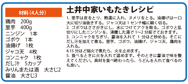 四国中央市の「土居のいもたき」は、関川の河川敷に並べられたテントの下で鍋を囲みます。3時間かけて鶏がらを煮込んだしょうゆベースのダシに、土居町産の里芋「伊予美人」、人参、ゴボウ、もやし、ネギといった野菜に、鶏肉、イカゲソなど、盛りだくさんの具材が入り、しめにはうどんを入れます。