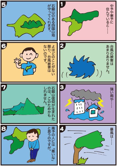 台風のシーズンになると、南予では大きな被害を被りますが、東中予では被害が多くありません。東中予に被害をもたらす台風は、太平洋から豊予海峡を抜けるか、瀬戸内海を横断するコースの場合です。台風やその影響による雨風は、四国山地によって弱められ、台風による被害も全国的に見て少なくなります。四国山地から受ける恩恵のために、四国山地の中心である石鎚信仰が生まれたのかもしれません。 |