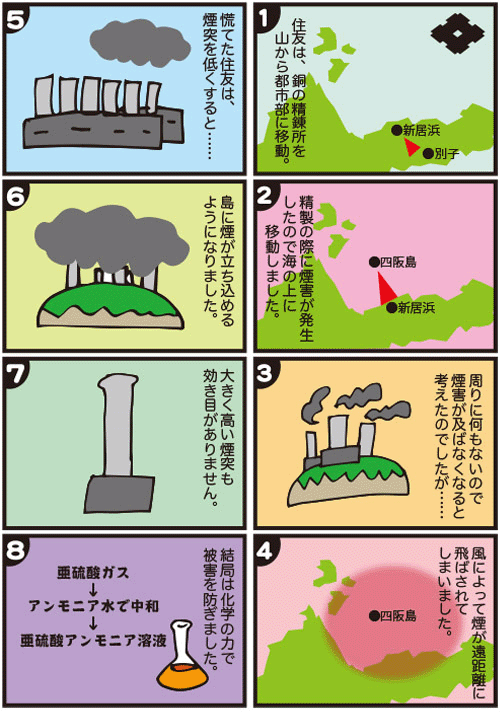 煙害は昭和4年(1929)よりペテルゼン式硫酸製造装置が導入されます。の発生が抑えられ、昭和14年(1939)には硫黄酸化物をアンモニアで中和する工場が完成。これにより、煙害に悩まされることはなくなりました。