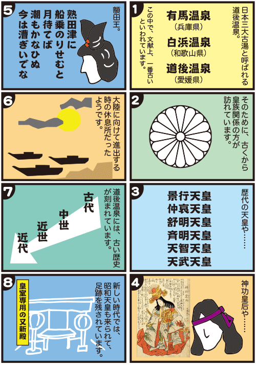 『日本書紀』は、百済救済のため、661年1月14日に朝鮮半島へ向かう斉明天皇や中大兄皇子らの軍勢が伊予国熟田津の石湯へ着き、二カ月あまりをこの地で滞在したといいます。熟田津の名前を有名にしたのは、万葉集の代表的歌人・額田王(ぬかたのおおきみ)の「熟田津に船乗りせむと月待てば潮もかなひぬ今は漕ぎ出でな」の和歌です。
