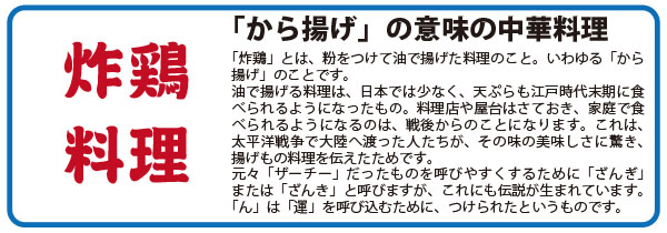 中国語では、鶏肉を揚げることを「炸鶏(ザーチ)」といいます。「せんざんき」は「炸鶏」料理のうち、「軟炸鶏(エンザーチ)」「清炸鶏(チンザーチ)」のことだと思います。 |