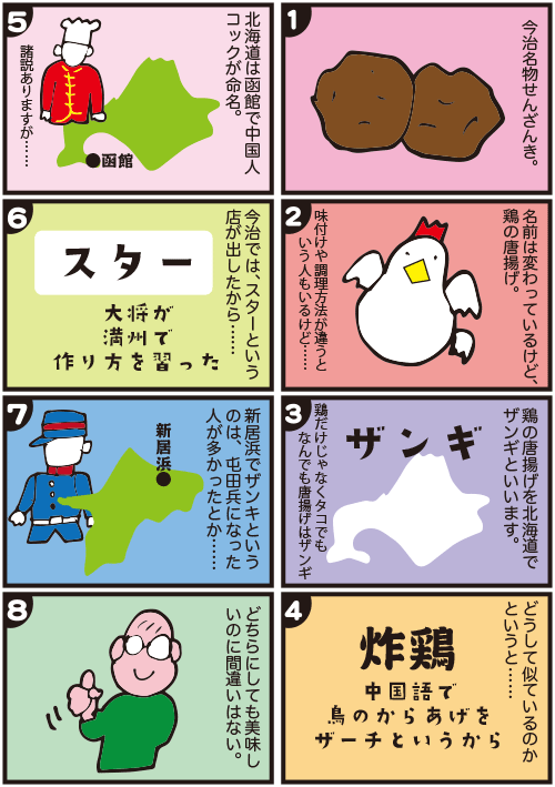 「せんざんき」は、今治地方で食べられる鳥の唐揚のことをいいます。この奇妙な名前には、さまざまな由来が語られています。