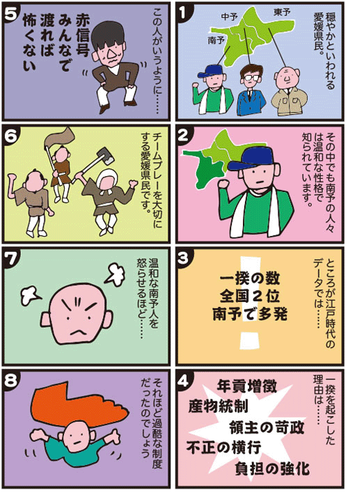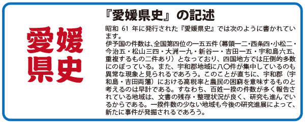 松山藩6代藩主・松平定喬の代、寛保元年(1741)7月5日から8月13日にかけて、久万山農民およそ3000人が隣藩大洲城下に逃散したという事件があります。逃散は百姓一揆の一つで、領主に反抗して他領に逃れようとするもので、領主側としては年貢は取れず、土地は荒れ、しかも悪政を天下にさらすことになるので非常に効果的でした。