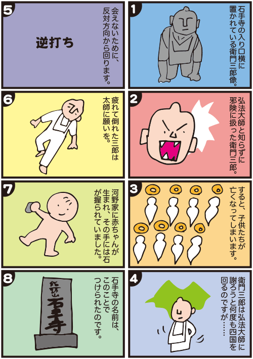 翌年、河野家に左手を握りしめた男の子が生まれました。両親がお寺へ連れて行き祈祷してもらうと、そこから「衛門三郎再来」と書かれた石が出てきました。