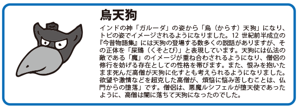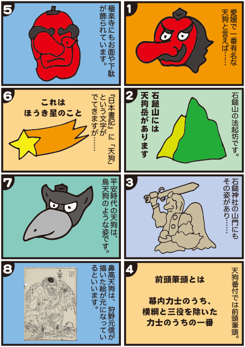 愛媛県で一番有名な天狗は、石鎚山の天狗岳に住む「法起坊(ほうきぼう)」です。修験者が、各地の霊山の天狗を招いて祈念を込める時に唱える『天狗経』に書かれている四十八天狗に名前が挙げられています。知切光歳著『天狗の研究』に掲載されている天狗番付によれば、西の前頭筆頭となっています。