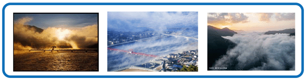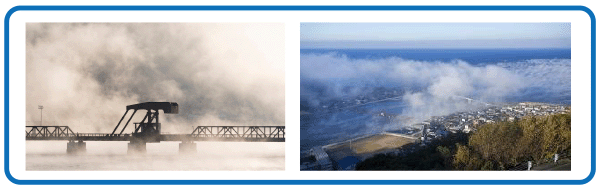 山間の盆地には、霧の発生が多く見られます。日中の気温が高く、川からの水分によって湿った大気が、夜になって急激に冷やされると川霧が発生します。大洲に面した伊予灘は陸地と比べて気温が下がりにくいため、温度差が発生して、重たい陸地の空気が軽い海上に向けて移動します。この移動する風が大洲の特殊な地形と気象条件がそろって、霧が下流から海に流れていくことをいいます。 |