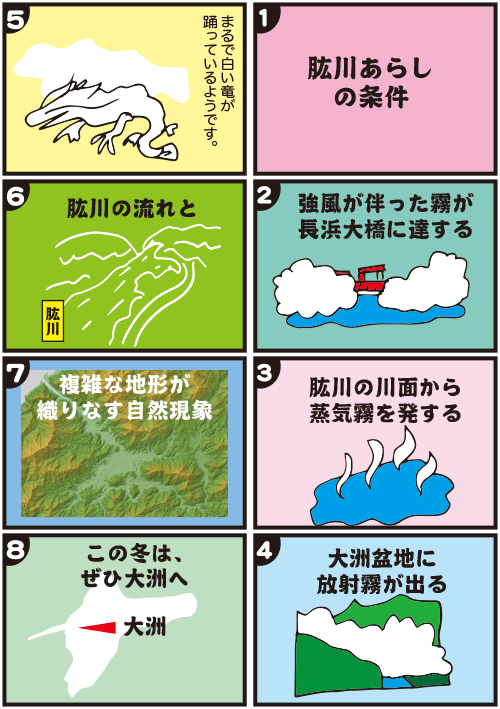 強風が伴い霧が長浜大橋に達すること、肱川の川面から蒸気霧を発すること、大洲盆地に放射霧が出ることの3つの条件が揃って、初めて「肱川あらし」と呼ばれます。