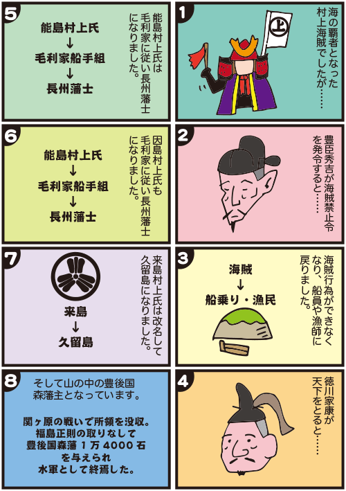 この年の9月8日、秀吉から小早川隆景に対して「能島氏が最近海賊を働いたとかいうが言語道断の行為だ」という書状が出されています。小早川隆景に処置は任せられましたが、「野島(武吉)が海賊行為を働いているようだから処分し、赤間(あかま)関以東に居住させてはならない」という秀吉からの厳命があり、武吉は周防(現山口県)の日本海側にある大津郡に移住しました。