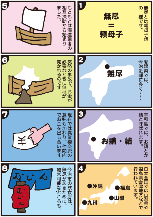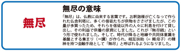 「無尽」とは、月に一度仲間が集まり、みんなからお金を集め、その中の一人にお金を得る権利が与えられるというものです。このシステムは、奈良時代から行われていたといい、無尽とか頼母子(たのもし)と呼ばれます。いわば庶民の相互扶助として始まったもので、江戸時代になると、宗教的な講と同様に、金融手段として確立し、大規模化して行きました。また、賭博にしたものもあり、しばしば禁令が出されています。