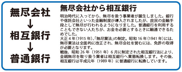 のちに無尽会社は銀行に相当するほどの規模を持つものまで存在するようになり、戦後のに相互銀行法が1951年に成立したため、相互銀行となったところもあります。 |